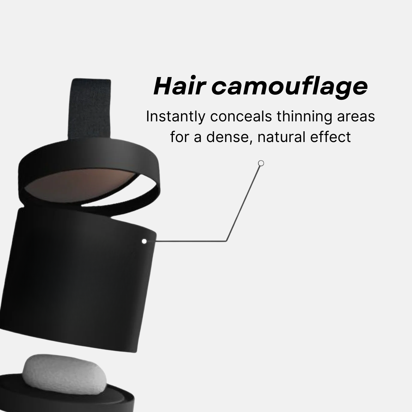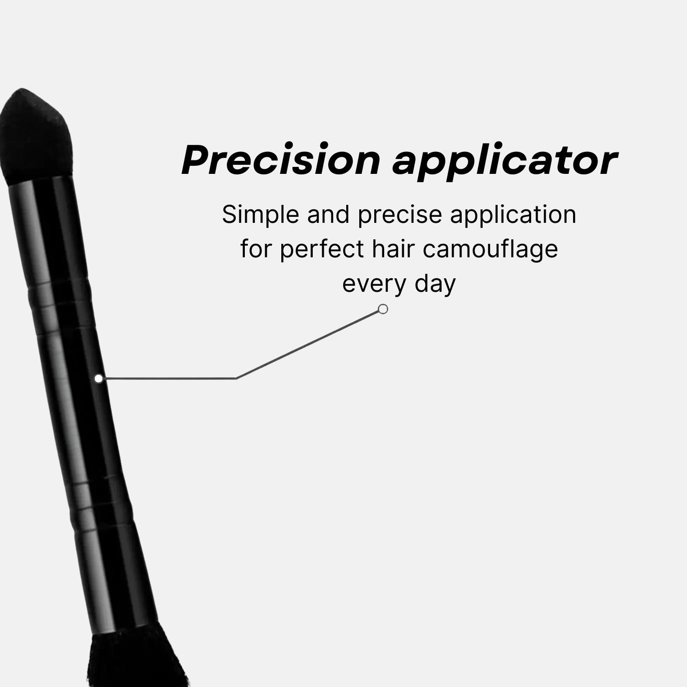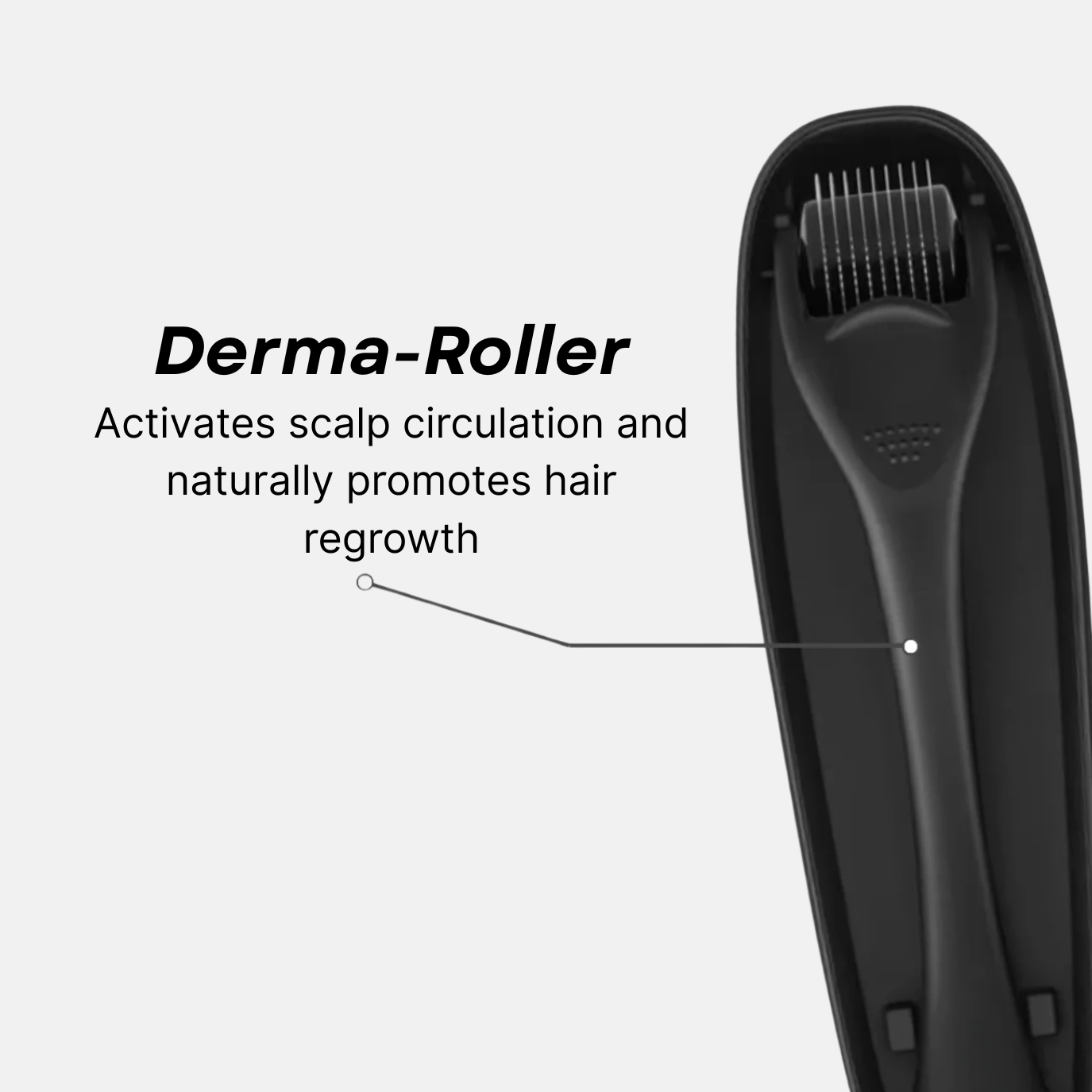 It’s a complete protocol against hair loss: instant camouflage with our hair fibers, regrowth stimulation with the natural strengthening serum, scalp activation with the dermaroller, plus accessories for precise application.